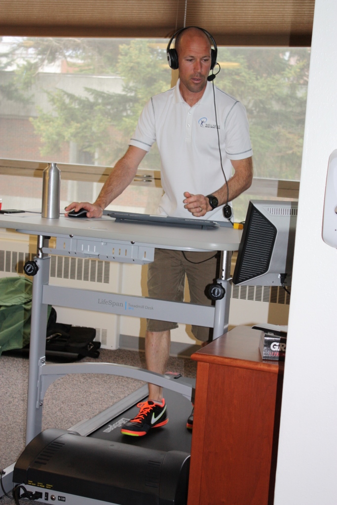 This Wednesday we had a great time presenting, “Sitting is the New Smoking” live from the MSU College of Education, Health and Human Development. The EHHD office recently added two new treadmill workstations, on one of which I was able to present the webinar. I must say that presenting and walking was quite challenging! I averaged around 1.8mph (very slow walk), but still found myself breathless at times as I tried to speak, gesture, and run a Powerpoint at the same time. My coworker Kelsey said I could multitask like a woman—that’s high praise! Even though challenging, it was really fun, especially with our “live studio audience” in the EHHD office. I ended up walking 4000 steps while presenting! In case you missed the webinar, we’ve included the Office Stretch and Exercise video we showed during the webinar, and a link to the webinar itself at the bottom of this post. Enjoy!