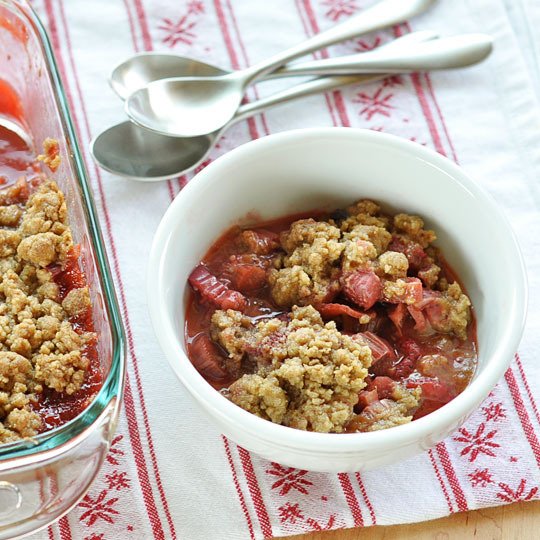 Preheat oven to 375 F. Combine fruit filling ingredients (may adjust sugar and lemon juice depending on type of fruit being used). Pour fruit filling into an 8×8 glass baking dish. Combine first 5 ingredients of crumble topping. Work butter into dry ingredients using a fork or fingers until large heavy crumbs are formed. Pour crumble topping over fruit. Bake for 30-35 minutes.
