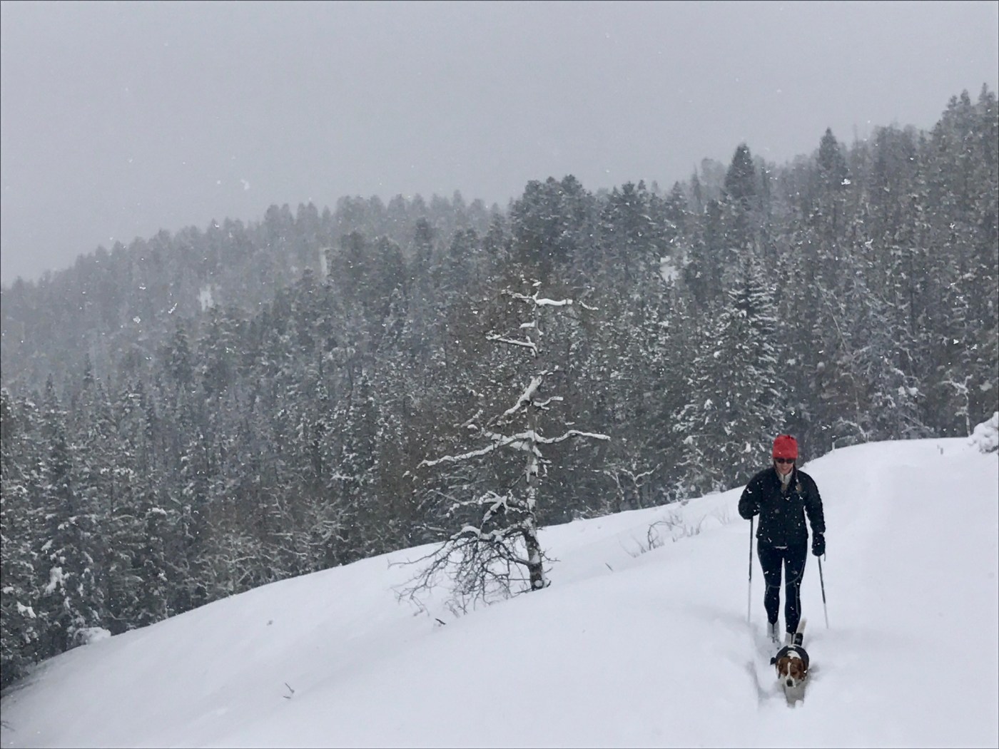 - Cross-country skiing in deep snow outside Dillon with a surprise guest—Gordy the overweight beagle. Gordy, though his legs were short, was not deterred about trailblazing for us in the deep snow, leaving his belly print with every enthusiastic stride.