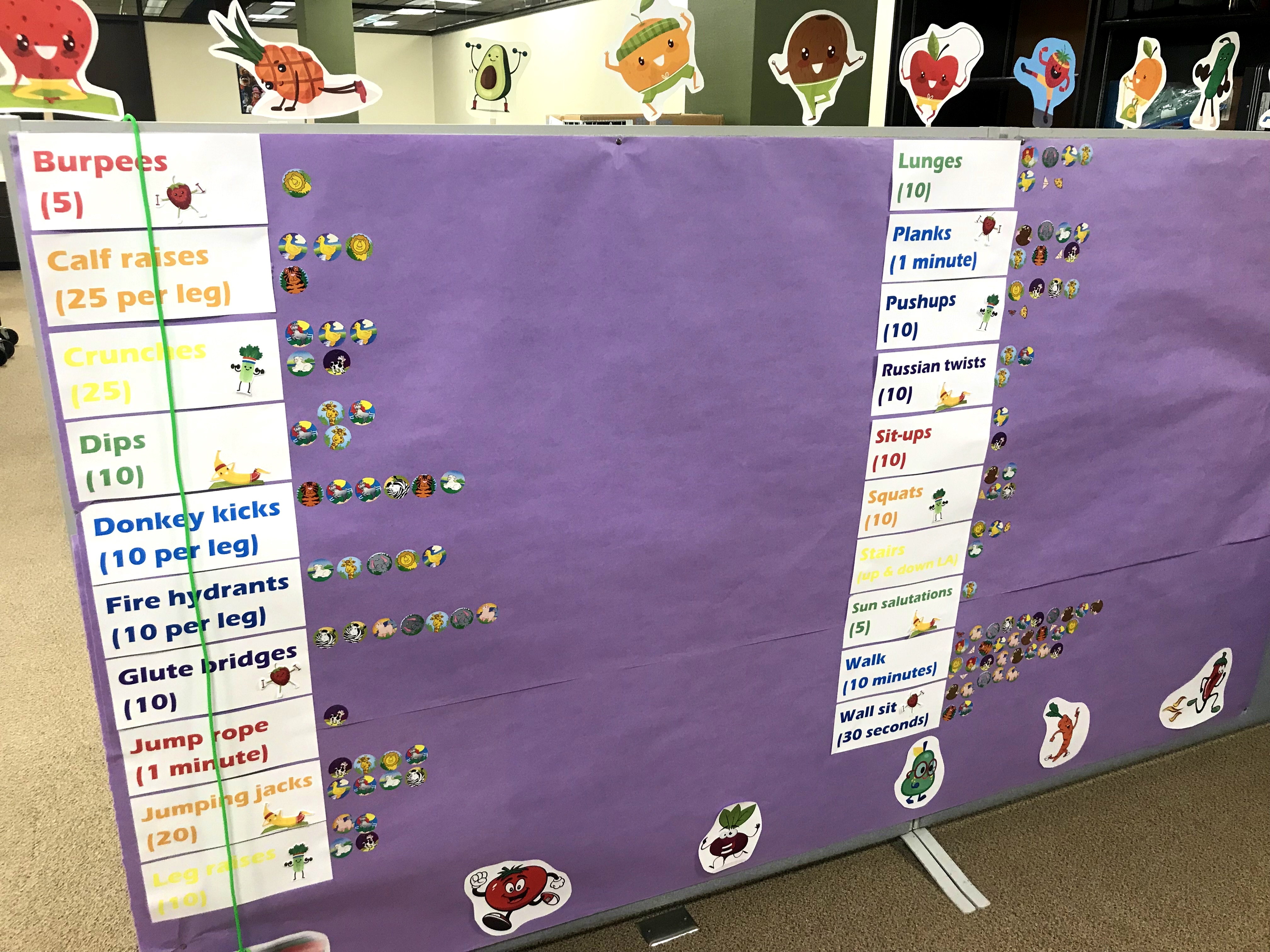 Some of the Library’s wellness-related activities right now include decorating the stairwell with inspirational signage to encourage taking the stairs rather than the elevator, and a designated activity area where you can earn stickers for performing certain exercises!
