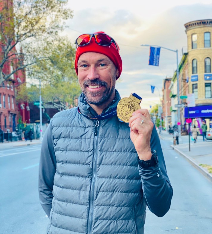 Post race. Back in Brooklyn, feeling good about being finished, and posing on the Marathon course, now clear of runners. It’s weird to be able to stand in the middle of a major avenue in New York City and mug for a photo. Generally not a good idea.